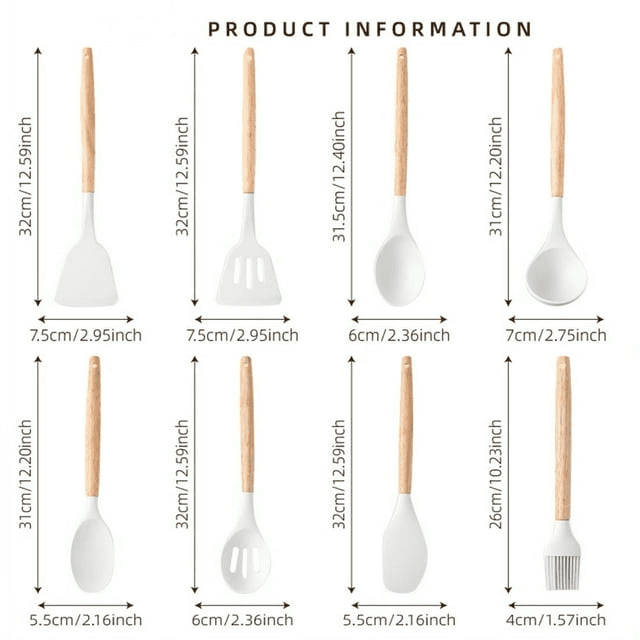 ��food-grade kitchen utensils set: this kitchen utensils set is made of food-grade silicone and durable acacia wood with heat resistance up to 464℉. Sturdy and flexible, it is an ergonomic kitchen utensil with reliable quality, comfort and