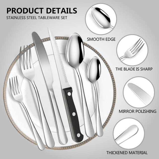 [48 pcs silverware set service for 8]: this silverware set comes with 8 dinner knife, 8 steak knives, 8 dinner forks, 8 dinner spoons, 8 salad/dessert fork and 8 dessert/tea spoons, essential for families or restaurants. The set is also an irreplaceable dining tool whether it is for daily use or for preparing dinners or parties.