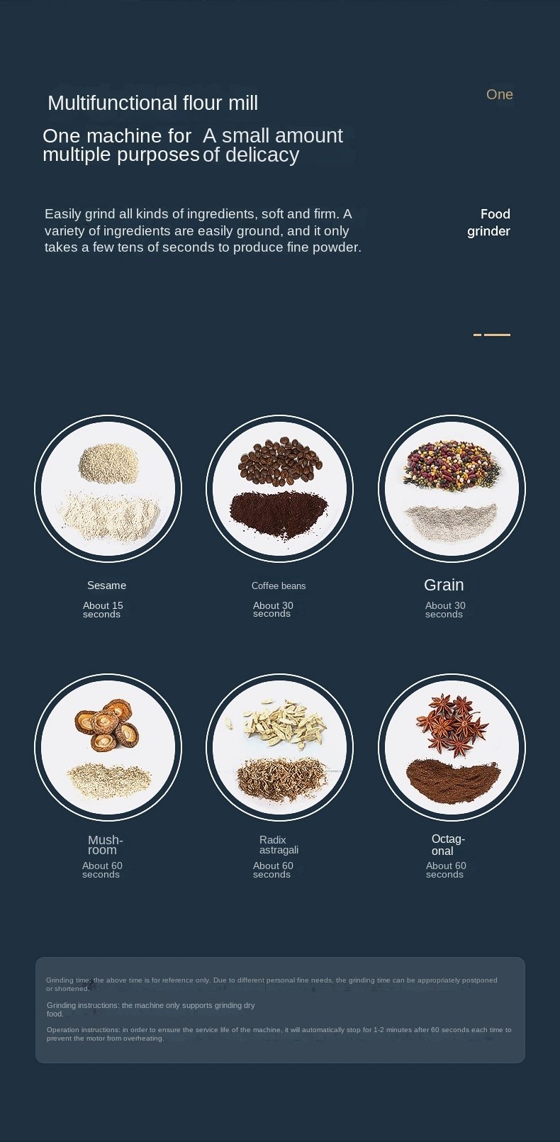 [Good Helper for Cooking]: Small size,big energy,Quick grinding with one click.crushing seasoning, supplement,meal powder,grinding herbs,grinding nutrients,grinding ingredients,coffee beans, nuts,herbs,grains,peppers,seeds,one key grinding,fresh and good life.Save you a lot of time to do other more meaningful things and enjoy your life easily.